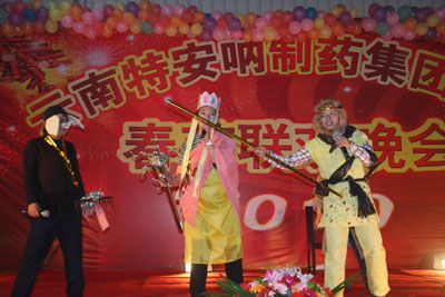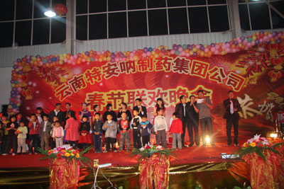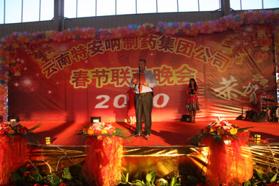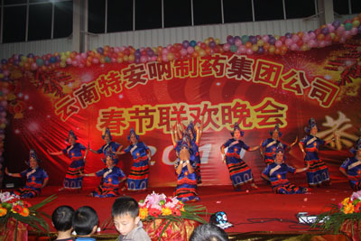 歡歡喜喜過大年,熱熱鬧鬧迎新春。2010年2月8日晚,云南特安吶制藥集團(tuán)公司內(nèi)外張燈結(jié)彩,裝飾一新,廠區(qū)上空回蕩著歡快、熱烈的新年音樂歌曲,處處洋溢著迎春賀歲的節(jié)日氣氛。文山州、縣領(lǐng)導(dǎo)及友好兄弟單位和特安吶公司全體員工共六百余人歡聚一堂,共賀2010年新春的到來,共享一年來收獲的喜悅。