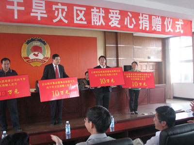 2010年3月2日,文山州政協(xié)組織各民主黨派、工商聯(lián)和非公經(jīng)濟(jì)界向干旱災(zāi)區(qū)獻(xiàn)愛心捐助活動(dòng),捐贈(zèng)會(huì)上,各界積極響應(yīng),踴躍捐款。我公司為弘揚(yáng)“一方有難、八方支援”的團(tuán)結(jié)協(xié)助精神,此次捐贈(zèng)會(huì)上共捐款10萬元,為受災(zāi)群眾提供援助,幫助災(zāi)區(qū)人民度過難關(guān),體現(xiàn)了公司“大災(zāi)面前有大愛”的社會(huì)責(zé)任心。