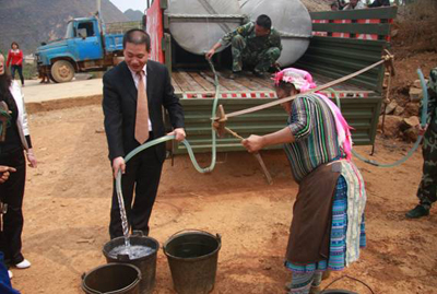 3月26日,公司副總裁向昌萬帶領三家送水單位,向文山縣古木鎮(zhèn)陰洞村42戶200多人送去5噸飲用水,解決了群眾的燃眉之急,并把600件礦泉水分送給周邊的紅石洞、陰洞、阿富、倮可母四所小學。古木鎮(zhèn)陰洞村屬旱情較為嚴重的地區(qū),往年缺水季節(jié)都會有1至2個月需要到村外水源地取水。此次近半年的旱情,使這些地區(qū)的群眾更是雪上加霜;周邊四所小學近400名學生,由于村外水源地供水不足,有時孩子們只能到附近溝渠取水,飲水衛(wèi)生情況令人堪憂。到達捐贈村莊后,送水隊員和村民一道裝運生活用水,為小學師生搬運礦泉水。清澈的泉水、大家的汗水,滋潤了干涸的土地和轄區(qū)群眾焦急的心。陰洞小學三年級的學生小志激動地說:“謝謝叔叔給我們送來了水,我們要好好學習,長大了像你們一樣做好事!”歡聲笑語回蕩在村莊上空,大地干涸,但每個人的心都因真情的交融,而變得澄澈潤澤。