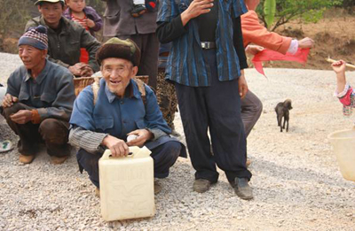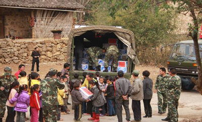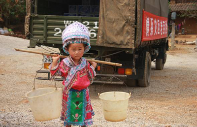 旱災區(qū)陰洞村村民幫助陰洞小學搬運捐贈礦泉水