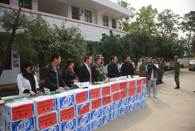 公司副總裁向昌萬同志為災區(qū)人民放捐贈飲用水