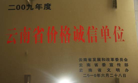 獲得2009年度云南省“價(jià)格誠信單位”稱號(hào)