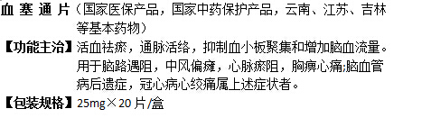 血 塞 通 片 (國家醫(yī)保產(chǎn)品,國家中藥保護產(chǎn)品,云南、江蘇、吉林等基本藥物)