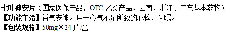 七葉神安片(國(guó)家醫(yī)保產(chǎn)品,OTC乙類(lèi)產(chǎn)品,云南、浙江、廣東基本藥物) 【功能主治】益氣安神。用于心氣不足所致的心悸、失眠。 【包裝規(guī)格】50mg×24片/盒