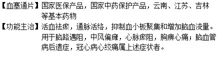 【功能主治】活血祛瘀,通脈活絡,抑制血小板聚集和增加腦血流量。用于腦路遇阻,中風偏癱,心脈瘀阻,胸痹心痛;腦血管病后遺癥,冠心病心絞痛屬上述癥狀者。
