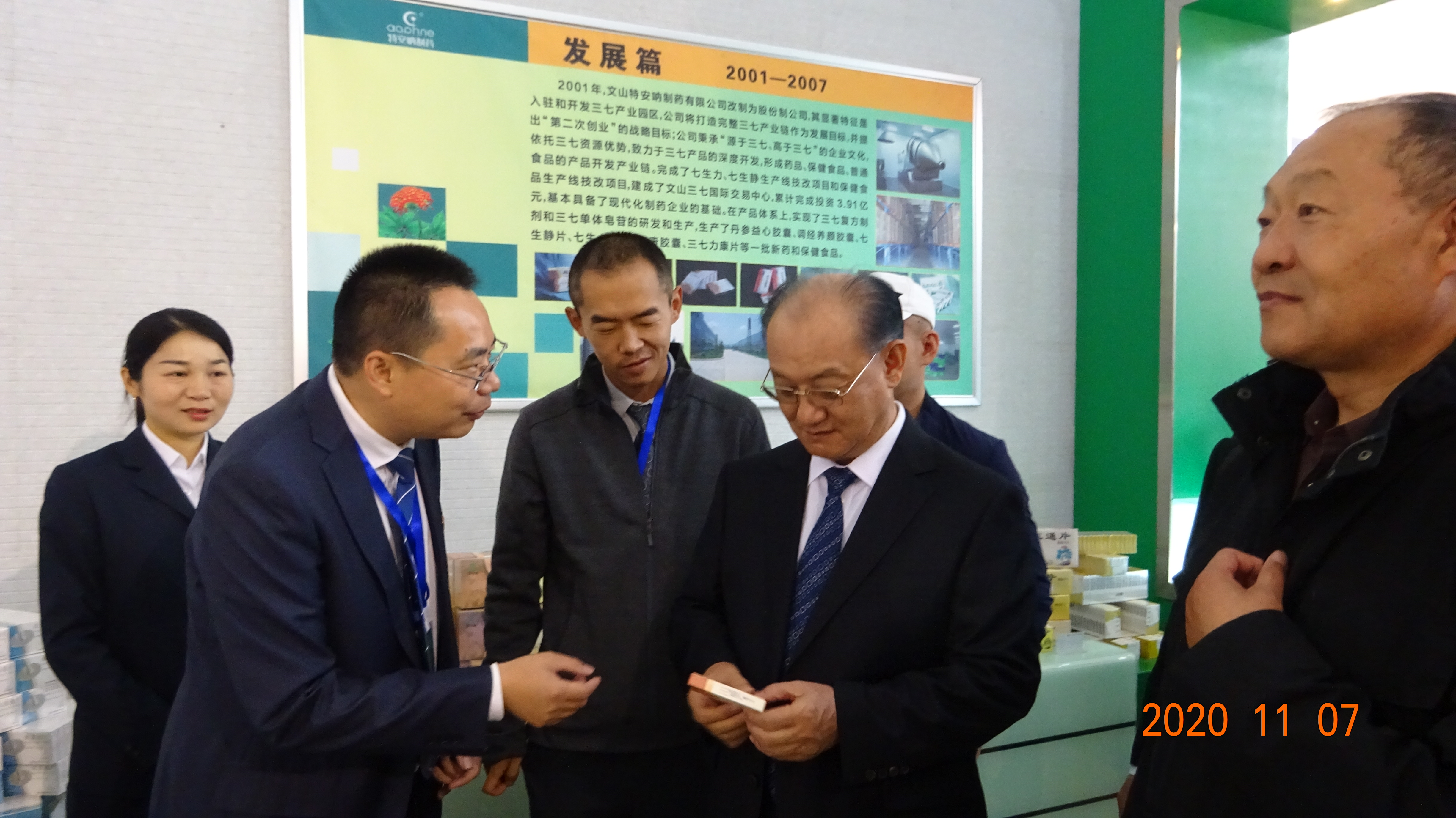 2020年11月7日,北京廣安門醫(yī)院原院長、國際歐亞科學院院士王階一行蒞臨特安吶公司參觀指導。云南康旅集團蔡嘉明副總裁、云南特安吶制藥股份有限公司副董事長兼總經理嚴野在展示廳迎接。嚴總向王階院士介紹了公司的創(chuàng)業(yè)歷程及產品情況,公司從租賃手工作坊生產到擁有占地200余畝、16條生產線的現(xiàn)代化生產基地,主打產品從頭痛粉、安乃近片到血塞通片、七生力片、七生靜片等三七系列精深加工產品的轉變,構建了“產品研發(fā)基地、三七GAP種植基地、中藥材加工基地、產品生產基地、物流倉儲基地”和“三七國際交易中心、商務服務中心、物資配套服務中心”為平臺的三七產業(yè)鏈。王階院士是云南文山人,這次是應文山州、市人民政府邀請,出席第六屆文山三七節(jié)。王階院士是主任醫(yī)師,博士研究生導師,中國中醫(yī)科學院首席研究員,從事中醫(yī)學臨床與研究二十余年,主持國家級科研課題10余項,主要研究方向為中醫(yī)藥防治心血管病、血瘀證與活血化瘀研究、中醫(yī)證候的規(guī)范化研究、中醫(yī)藥防治艾滋病等,發(fā)表核心期刊論文200余篇,SCI論文40余篇,總影響因子>100,所發(fā)文章被PlosOne、JEthnopharmacol等國內外著名期刊引用3000余次,主編著作10余部,榮獲國家科技進步一等獎1項,中華中醫(yī)藥學會科技進步一等獎2項,及其他省部級獎勵9項,國家發(fā)明專利3項。王院士可以說與特安吶公司頗有淵源,2001年公司在北京召開“特安吶產品研討會”時,王院士就出席了會議,為公司的產品研發(fā)提出了很好的意見。王院士拿起公司生產的產品“阿咖酚散”說,這個產品很好,見效快、價格低,治療頭痛發(fā)熱一包見效。王院士詳細詢問了公司主打產品“血塞通片”的生產及銷售情況,叮囑一定要把產品做實做優(yōu)做大。王院士指出公司的產品有較強的優(yōu)勢,如丹參益心膠囊,在治療冠心病、心絞痛等方面有確切療效,要好好進行產品二次開發(fā)。王院士與嚴野總經理就產品開發(fā)、臨床試驗、市場推廣等方面進行了交流,他希望公司立足于文山三七,加強與科研院校合作,引領三七產業(yè)發(fā)展,為中醫(yī)藥事業(yè)做出新的更大的貢獻。