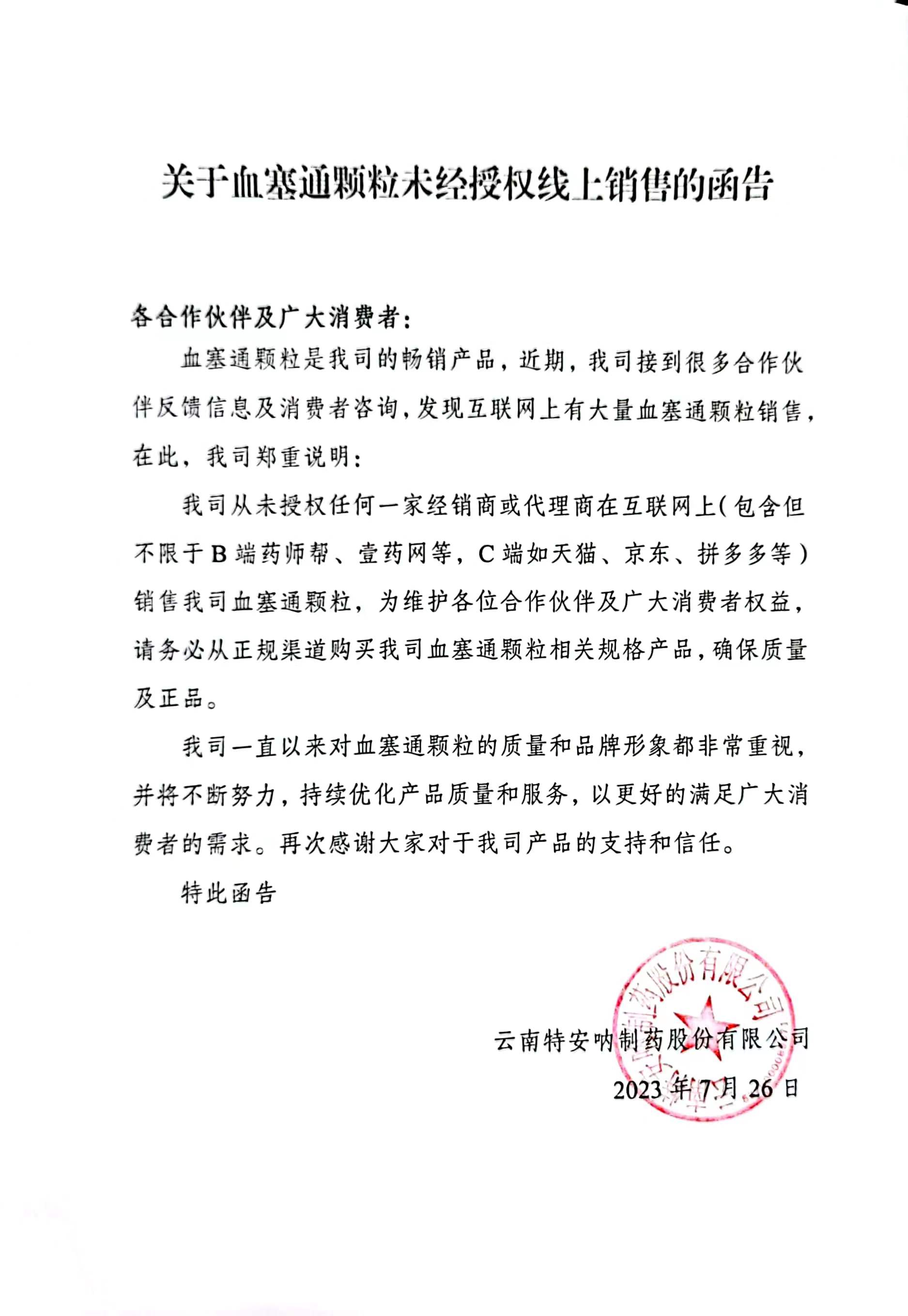 關(guān)于血塞通顆粒未經(jīng)授權(quán)線上銷售的函告