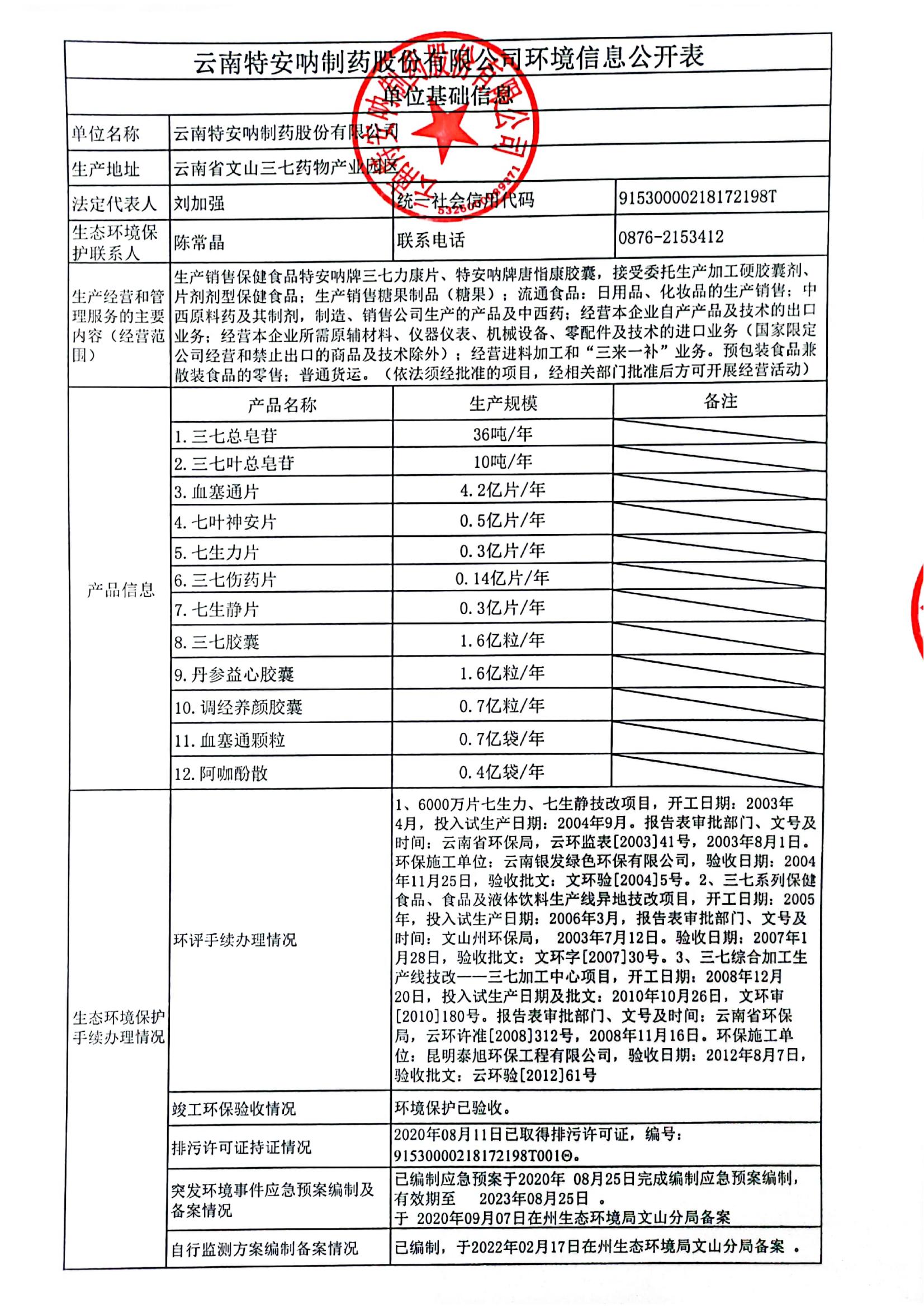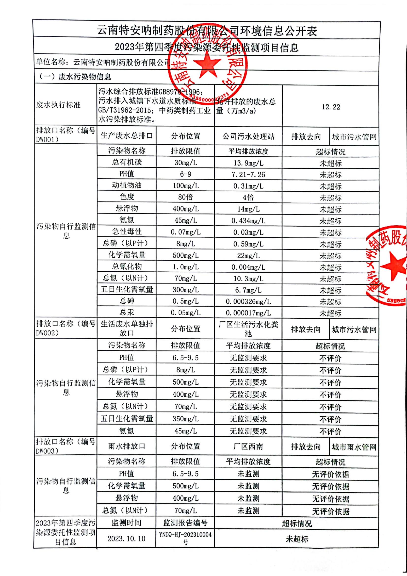 2023年第四季度云南特安吶制藥股份有限公司環(huán)境信息公開(kāi)表