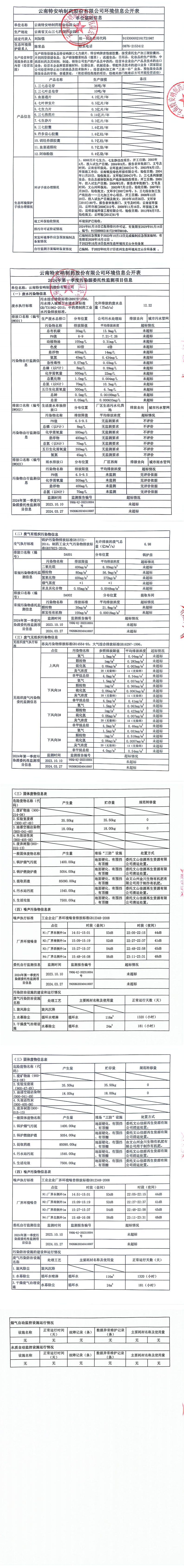 云南特安吶制藥股份有限公司2024年一季度環(huán)境信息公開(kāi)表