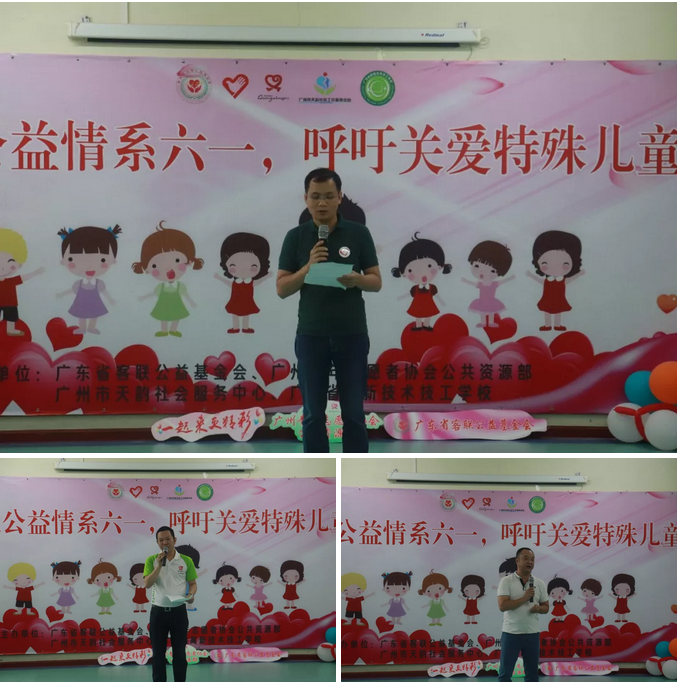 活動首先由主辦單位廣東省客聯(lián)公益基金會鄧爭明理事長、廣州市青年志愿者協(xié)會張軍文和協(xié)辦單位廣州天韻社會服務中心鄒雷理事長講話,向“廣州市天韻社會服務中心”的小朋友們和辛勤勞動的老師們表示真摯的節(jié)日問候。