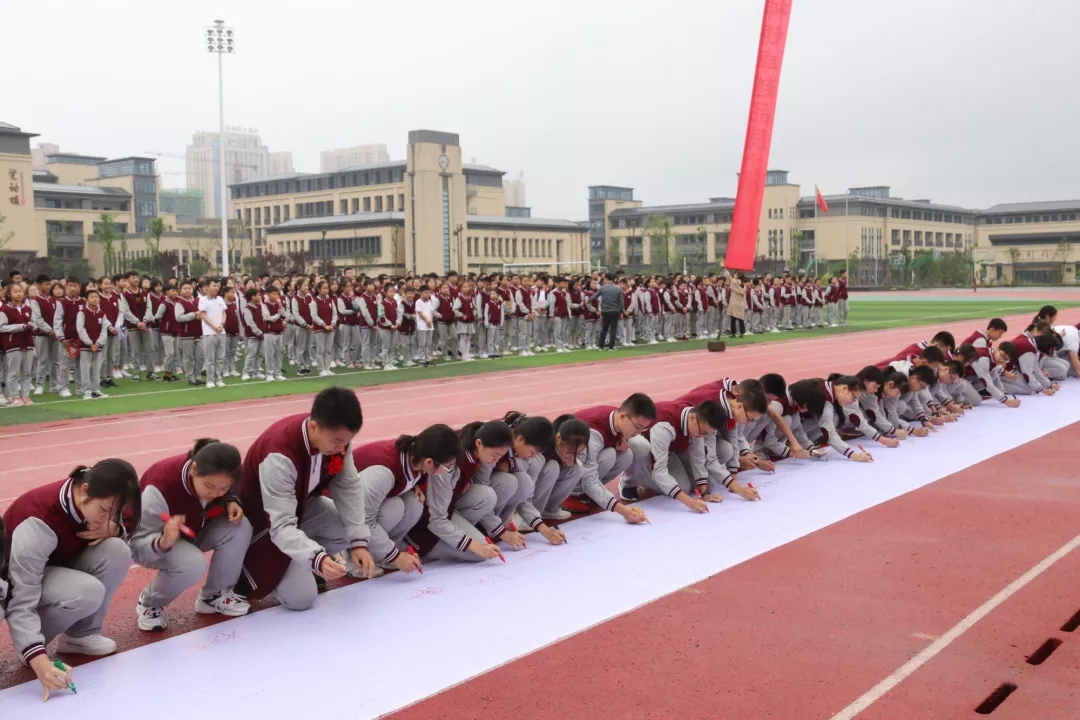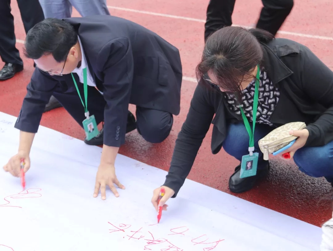 之后,師生們來到了百米長卷面前,用筆墨書寫了心聲和誓言。大家不忘初心,牢記使命。主席臺上,高一年級的張?jiān)婄?、曾伊萌、孔令羽和鄭暢同學(xué)為我們帶來了歌曲演唱《最初的夢想》。歌聲飄蕩在衡川運(yùn)動場的上空,最初的夢想永遠(yuǎn)在我們心中。