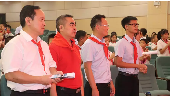 大隊輔導員宣布122名一年級小學生被批準加入中國少年先鋒隊,正式成為光榮的中國少年先鋒隊隊員,高年級的同學們做為老隊員為新隊員們佩戴上了鮮艷的紅領巾,當鮮艷的紅領巾佩帶在他們的胸前時,新隊員的臉上都洋溢著激動與自豪。