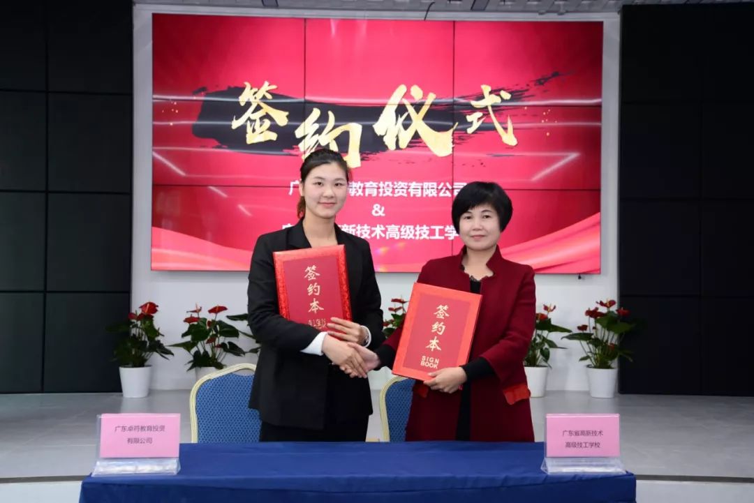 廣東卓符教育投資有限公司蓓蕾實驗幼兒園園領(lǐng)導(dǎo)游堯與廣東省高新技術(shù)高級技工學(xué)校執(zhí)行校長肖中圓簽定合作協(xié)議。