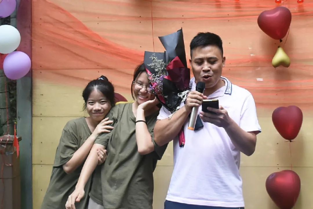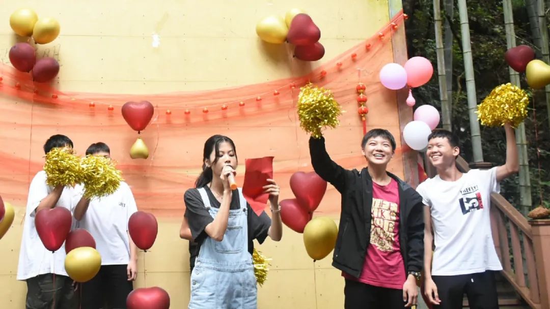 吃飽喝足便是節(jié)目表演環(huán)節(jié),老師的《日不落》活躍氣氛,現(xiàn)場成為打歌舞臺,輕快酷炫的rap讓大家飽享耳福,搞笑有趣的廣西版《有何不可》讓大家捧腹大笑,熟悉的歌謠使得在底下的觀眾情不自禁地跟唱起來,小伙伴們組成一個個小團隊,在舞臺散發(fā)著獨具特色的光芒,歌聲夾著尖叫聲,打call聲響徹丫山,送花合影讓我們更親密了,每個人的臉上都洋溢著笑容,負責(zé)接送我們的劉老師最后也按捺不住了,唱起了動聽的經(jīng)典歌曲《濤聲依舊》和《橋邊姑娘》。