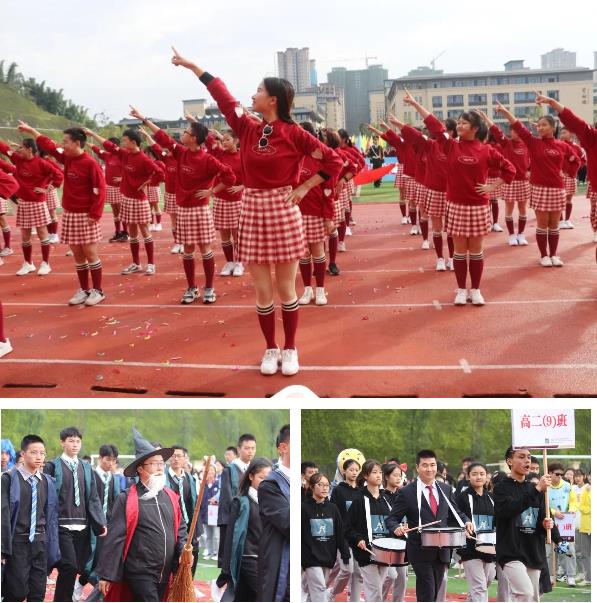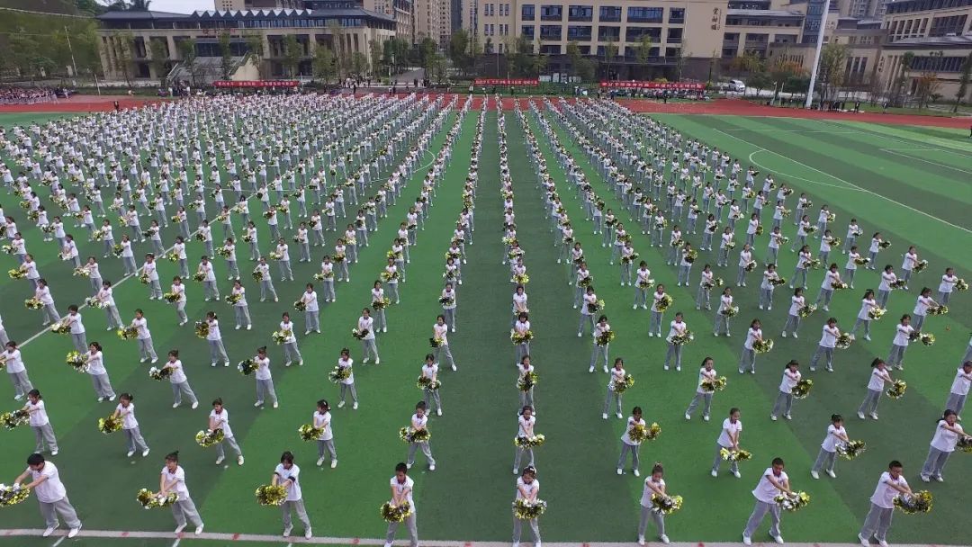 潔白的和平鴿應(yīng)聲而起飛向藍(lán)天,鼓樂隊(duì)奏響激昂的運(yùn)動(dòng)員進(jìn)行曲,班旗方陣與彩旗方陣的百余名同學(xué)擎著代表班級(jí)榮譽(yù)的旗幟,帶起陣陣破風(fēng)之聲,這聲音不僅預(yù)示著運(yùn)動(dòng)會(huì)的勝利開幕,更彰示著自貢衡川定將勢(shì)如破竹,走向更高的天空。初一、高一 花球啦啦操